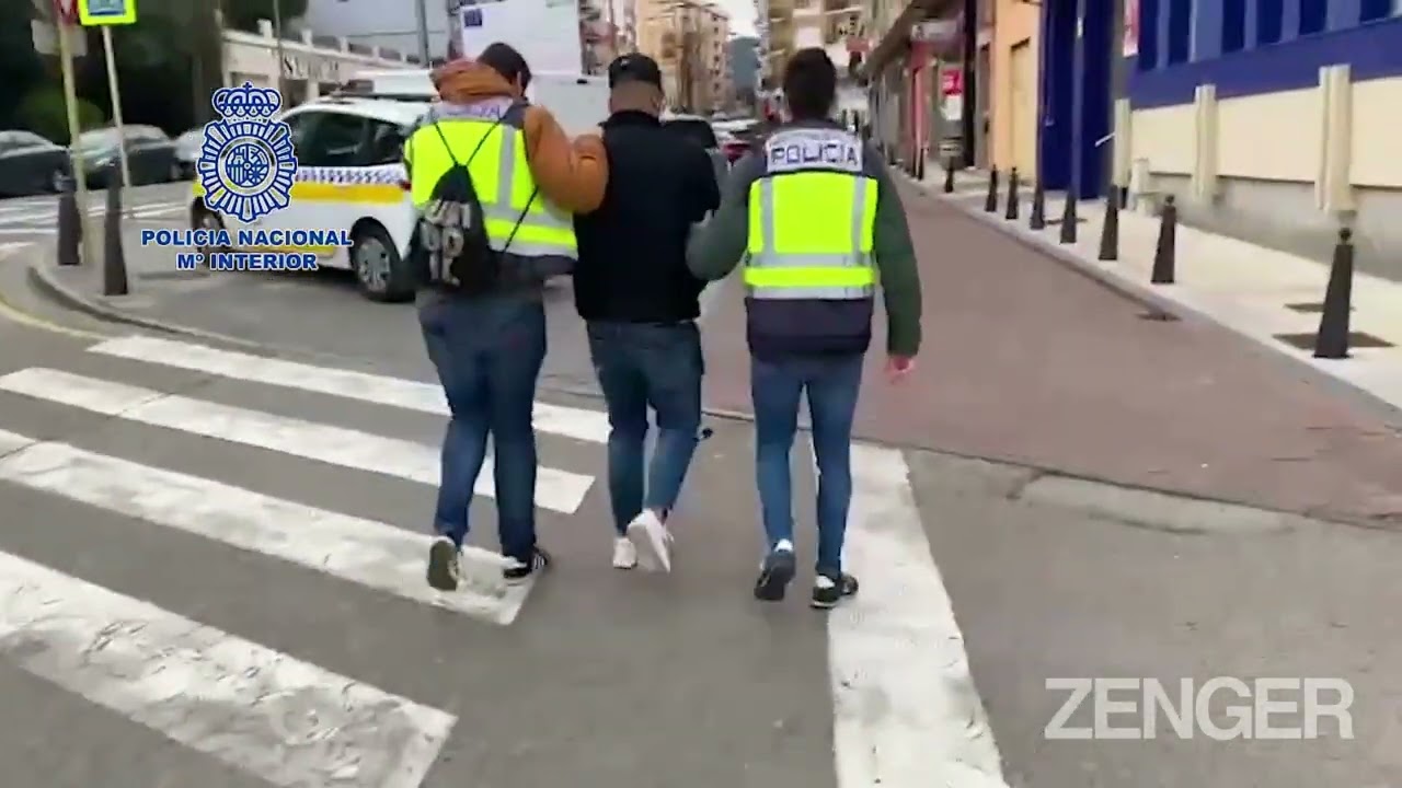The footage shows two police officers in Spain taking one of the alleged members, unnamed, of the illegal migrant trafficking organisation, which found migrants to traffic on social media networks, into custody.